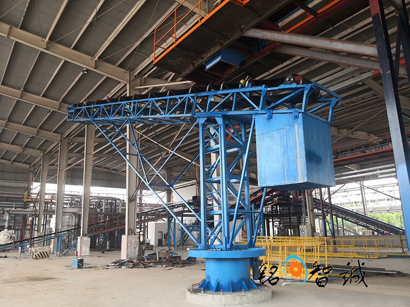 旋轉(zhuǎn)式皮帶輸送機(jī),為散碎物料倉貯輸送設(shè)備,是在安裝有行走輪的支架上部的底盤上安裝一轉(zhuǎn)盤,轉(zhuǎn)盤可相對底盤作旋轉(zhuǎn)運(yùn)動(dòng),皮帶輸送機(jī)的進(jìn)料端座在轉(zhuǎn)盤頂部的托盤上,出料端為懸臂式,配重箱在托盤上用以上與懸臂配重,倉貯時(shí),物料通過料斗由輸送帶送至遠(yuǎn)端,推動(dòng)懸臂即可改變堆積位置,在庫房內(nèi)實(shí)現(xiàn)多點(diǎn)堆積而勿需停機(jī)和移動(dòng)機(jī)體,連續(xù)作業(yè)省時(shí)省力,操作方便,尤其適用于糧食的倉貯輸送。